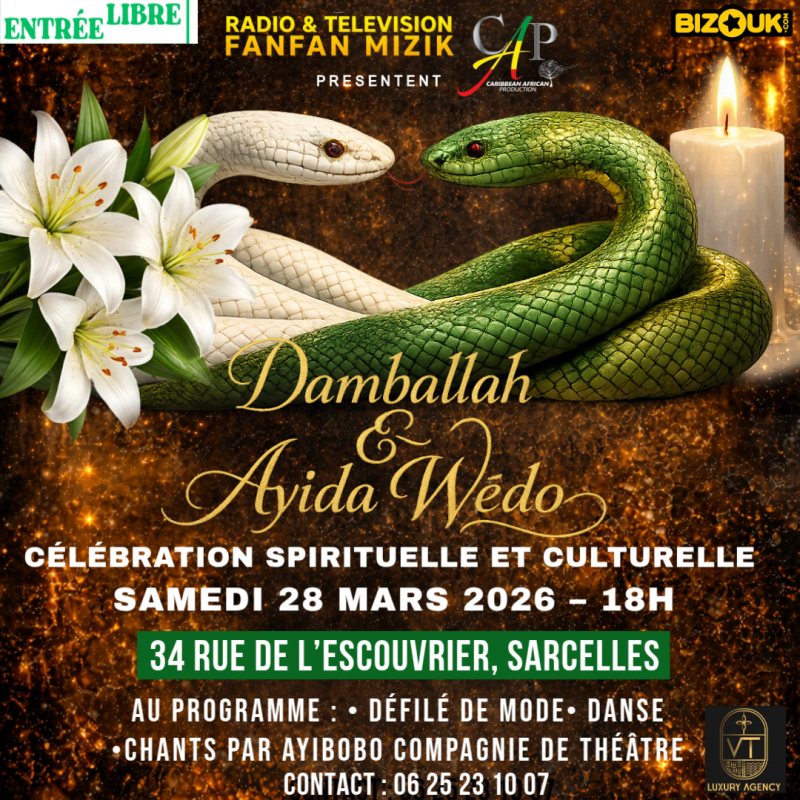 Damballah & Ayida Wèdo Célébration spirituelle et culturelle Radio TV Fanfan Mizik et CAP Productions, en collaboration avec Clermezine Paris, organisent une célébration dédiée à Damballah & Ayida Wèdo, figures majeures du Vodou haïtien. Un moment de partage autour de la culture, de l’art et de la transmission. Au programme : Défilé de mode Danse Chants par Ayibobo Compagnie de Théâtre Artistes invités
