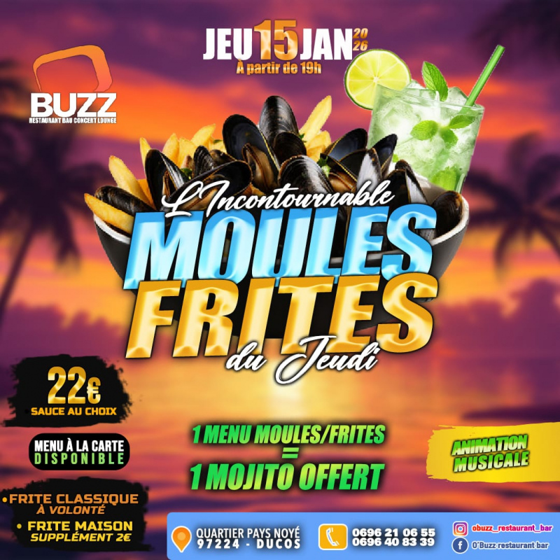 Ce jeudi, une soirée Moules Frites Mojito ,et attention, on a prévu toutes les sauces pour combler vos papilles : *Marinière, à la crème fraîche, Roquefort ou Curry-Coco*. Le plus dur ? Choisir !