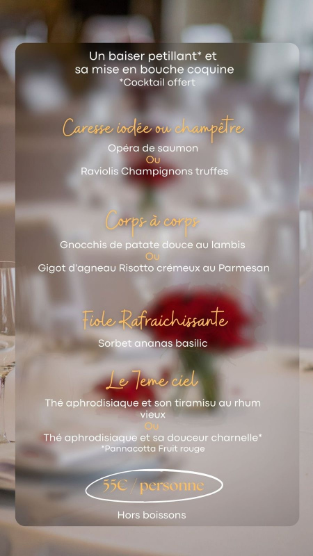 Un menu spécialement imaginé pour l’occasion, mêlant finesse, gourmandise et produits soigneusement sélectionnés, dans une ambiance intime et raffinée.