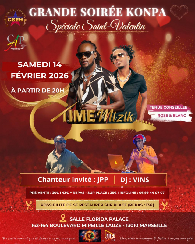 Le C.S.E.H vous convie à une soirée Konpa Spéciale Saint Valentin le Samedi 14 Février à partir de 20 h avec le groupe "TIME MIZIK" invité JPP avec Dj VINS à la Salle Florida palace 164 Bv Mireille Lauze 13010 Marseille. Infos: 06 99 44 07 07