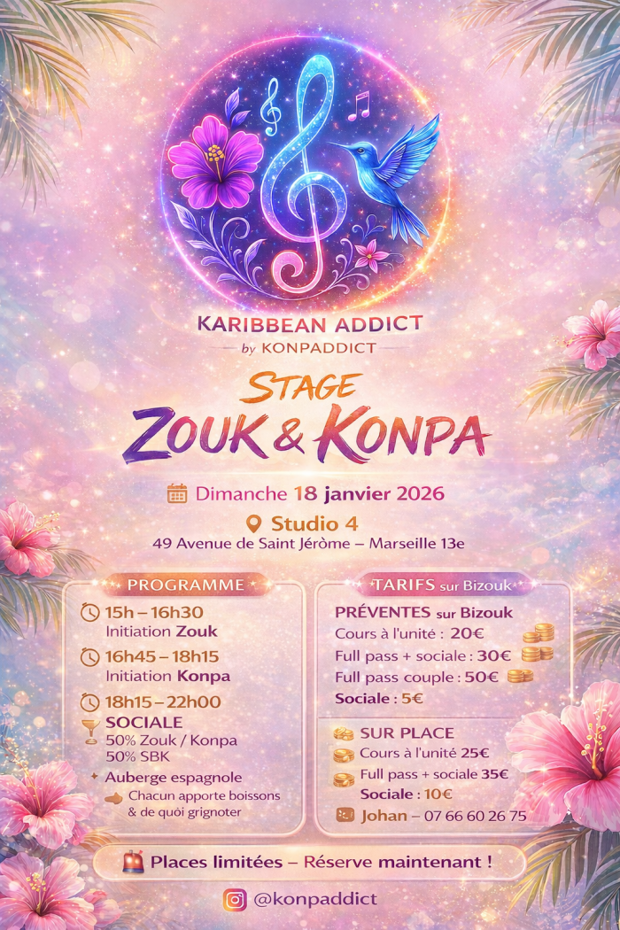 Konpaddict t’invite à un stage Zouk & Konpa suivi d’une sociale le 18 Janvier à Marseille !