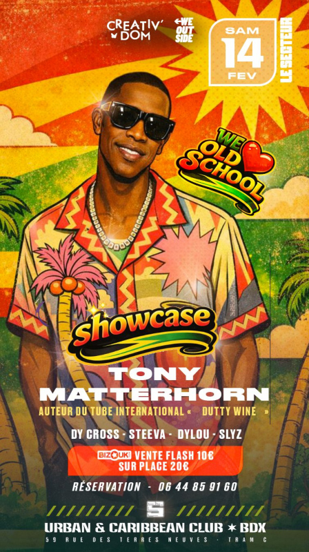 Wos Event31 & Creative Dom vous donne rendez-vous pour la plus grande Messe du Dancehall comme nul par ailleurs.. retraçant les année 90-2000 , nos plus gros Classics Old School . Et pour immortaliser cette soirée d’exception l’artiste Jamaïcain auteur du Hit International « DUTTY WINE » TONNY MATTERHORN nous fera l’honneur d’être présent en exclusivité à Bordeaux !!
